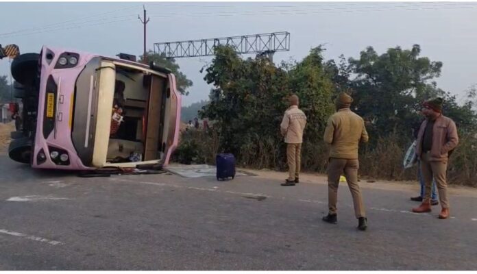झाँसी में बड़े सुबह एक चौराहे पर चीख पुकार मच गई जब झाँसी के थाना सीपरी बाजार क्षेत्रान्तर्गत दिल्ली से सागर म0प्र0 जा रही प्राइवेट बस ग्रासलैंड के पास पप्पे पंजाबी ढाबा के पास बैक करते समय पलट गई जिसकी सूचना पर स्थानीय पुलिस द्वारा तत्काल मौके पर पहुँचकर बस में बैठी सवारियों को सुरक्षित बाहर निकाला गया कुछ यात्रियों को मामूली चोटे आई है, जिन्हे उपचार हेतु अस्पताल भेजा गया है। जिसमें कई सवारियों का आरोप था कि ड्राइवर बस सही से नहीं चला रहा था इस सम्बन्ध में क्षेत्राधिकारी नगर लक्ष्मीकान्त गौतम ने की वीडियो जारी किया है