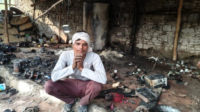 घर के ऊपर से बिजली का तार निकला है और घर की बगल पर बिजली का खंभा लगा है। बिजली के तार से शॉर्ट सर्किट होने की वजह से घर में आग लग गई और घर का पूरा सामान जलकर राख हो गया